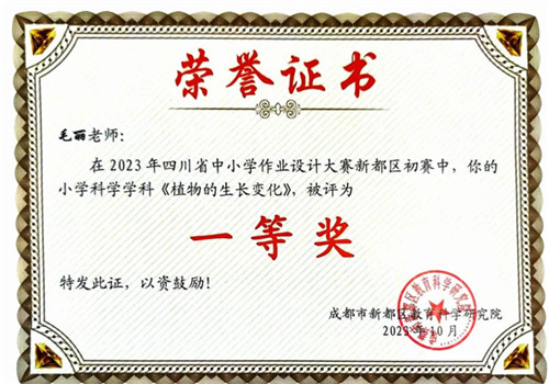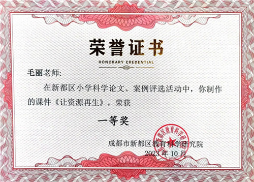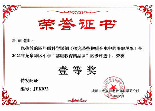 2023年,毛丽的课件《让资源再生》分获市级二等奖与区级一等奖,微课《水能溶解多少物质》斩获市、区两级奖项,作业设计《植物的生长变化》获区级一等奖,在龙泉驿区“基础教育精品课”评选中,《探究某些物质在水中的溶解现象》再获区级一等奖,形成覆盖课件、微课、作业设计的全维度教学创新体系。