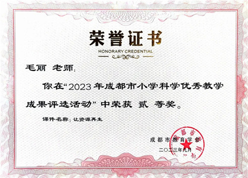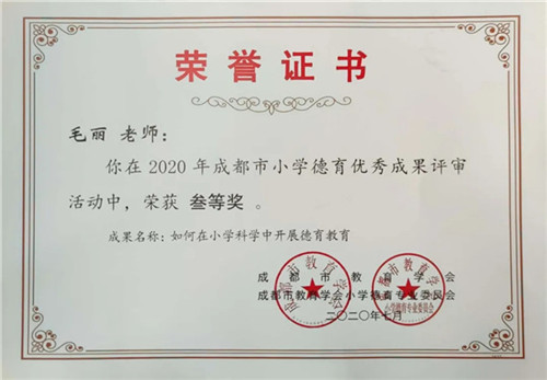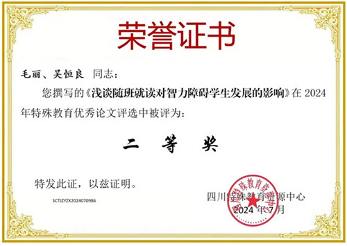在德育与特殊教育融合领域,毛丽的成果《如何在小学科学中开展德育教育》获成都市小学优秀成果评审叁等奖,《随班就读对智力障碍学生发展的影响》获四川省特殊教育优秀成果评选二等奖,为跨学科育人提供实践参考。