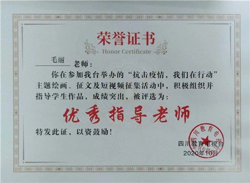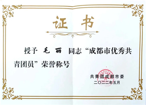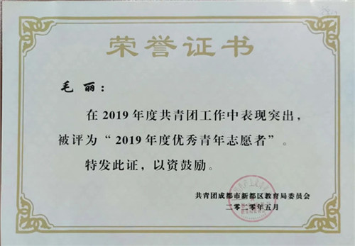 2019年,她获评“优秀青年志愿者”,被四川教育电视台评为“优秀指导老师”。2022年,获评“成都市优秀共青团员”。