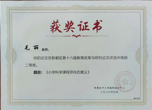 这种“从做中学”的理念延伸至教研领域,她撰写的《小学科学课程存在的意义》获新都区教育改革与研究论文二等奖,从理论层面解构科学教育的生活价值;《蔷薇花下敏感的爱》则以教育叙事的细腻笔触,摘得区教育叙事评选二等奖,展现科学教育中情感育人的维度。