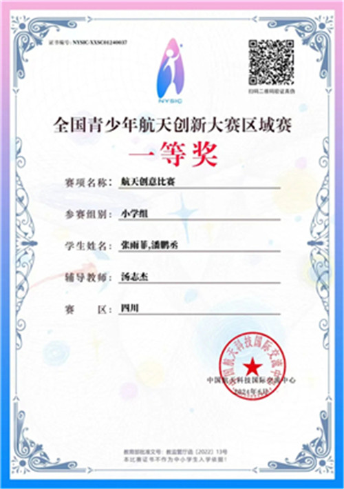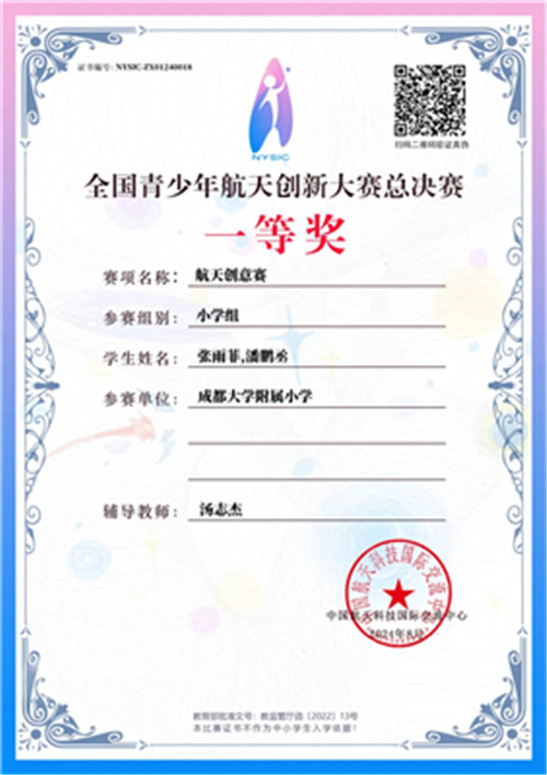 在全国青少年航天创新大赛区域赛和总决赛的航天创意比赛小学组中,潘鹏丞与张雨菲携手合作。他们共同学习航天知识,交流创意想法,克服了团队合作中沟通、分工等难题,他们相互鼓励、齐心协力,不断完善航天创意作品。最终,在区域赛和总决赛中均荣获一等奖。