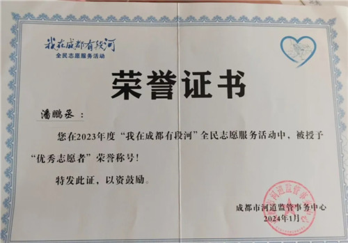 更难得的是,他坚持一年每周两次巡护成都复兴桥至合江亭河段,风雨无阻,因此在2023年底荣获成都市全民志愿者活动“我在成都有段河”优秀志愿者。