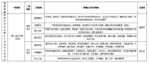 回溯转型起点,2024年9月,黄水小学立足“五育并举”教育理念,正式构建“五彩水宝”学生综合素质评价体系。该体系以“德、体、美、劳、智”五大核心素养为坚实框架,创新对应“红、绿、橙、黄、蓝”五种色彩标识——红色象征“品正行端”的品德素养,绿色代表“心灵体健”的体育素养,橙色彰显“艺美创佳”的美育素养,黄色蕴含“勤耕善作”的劳动素养,蓝色则对应“学渊思广”的智育素养。从理想信念、健康生活、艺术表达,到劳动能力、学科学习,体系下设一级指标5项、二级指标13项、三级指标38项,更细化出百余条可观测、可量化的评价规则,形成层级清晰、维度全面、评价多元的学生成长评估网络。
