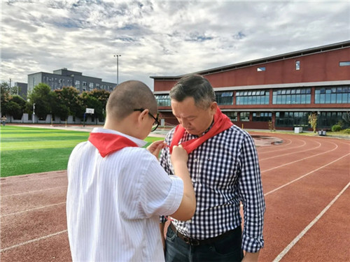活动伊始,优秀大队委们庄重地为中队辅导员及校领导佩戴红领巾。