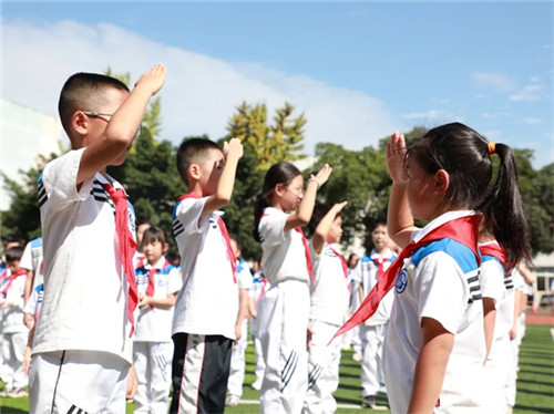 在响亮的出旗曲中,旗手们踏着整齐的步伐,精神抖擞地进行着庄严的出旗仪式,建队日活动由此拉开序幕。队旗下,队员们齐唱队歌,铿锵的歌声不仅传递着对党、对祖国、对人民的热爱之情,更是对少先队未来的憧憬与期待。