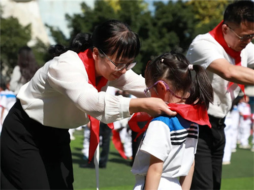 最激动人心的传承时刻来临!石室联中132学校党总支副书记、校长王小兰,专职副书记张剑,副校长杨关银,副校长陈巍等领导,四、五年级少先队员为二年级新入队小飞侠们佩戴红领巾,这不仅是一条红领巾的传递,更是一份责任与精神的传承。