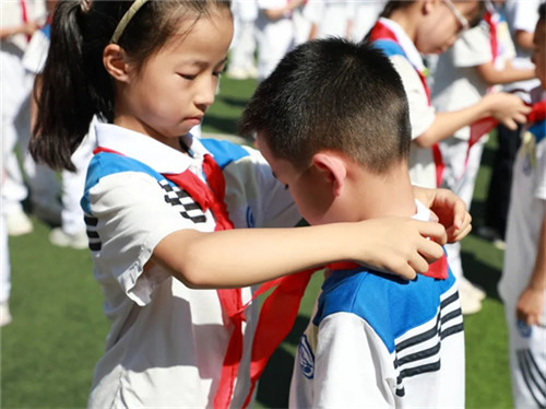大队长代表王行惜带领队员们在队旗下宣誓。大队辅导员程舒婉老师对新队员提出希望和要求。接着,全体少先队员在程舒婉的带领下,一起紧握右拳,齐声呼号:“准备着,为共产主义事业而奋斗!”“时刻准备着!”