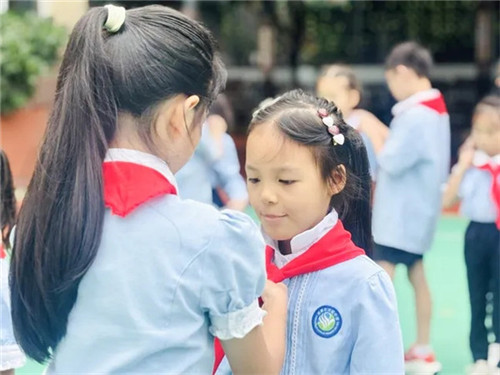 在火红的队旗下,大队委宣读了新入队成员名单,优秀少先队员们为新队员代表佩戴上了鲜红的红领巾。