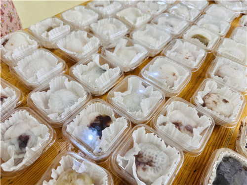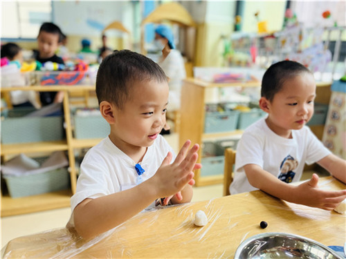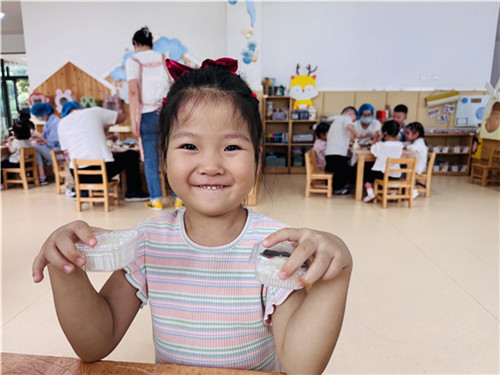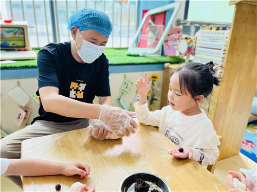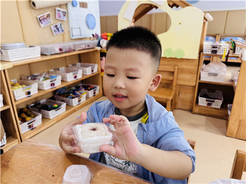 “哇,你们看,我自己做的月饼!”萌娃们举着刚刚成型的手工月饼,自豪地展示着。教室里,孩子们在家长志愿者和老师的帮助下,专心致志地用月饼模具制作传统月饼。