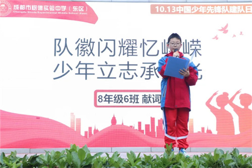 闭幕式以升国旗仪式开篇,激昂的《义勇军进行曲》响彻运动场,五星红旗冉冉升起,全体师生肃立敬礼。正值少先队建队日来临之际,八年级六班学子以“传承红领巾精神,续写运动新荣光”为主题带来国旗下献词,将运动会中的热血瞬间与少先队的初心使命紧密相连。