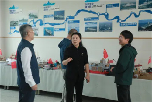汇报结束后,专家们深入校园,感受育人氛围。三楼的海洋与国防科普区里,学生绘制的“中国航母发展时间轴”精准标注着从“辽宁舰”到第三艘航母下水的关键节点;海洋手工作品展中,用废旧材料制作的“万吨大驱”模型细节逼真;每个班级门口的海洋主题环创里,藏着孩子们对“深蓝世界”的奇思妙想。