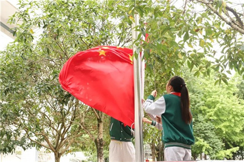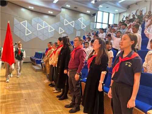 在激昂的国歌声中,五星红旗冉冉升起,迎风飘扬。五(2)中队的队员们全情投入演出,朗诵铿锵有力,舞蹈朝气蓬勃。歌声嘹亮而悠扬,传递出他们对少先队组织的深深热爱与无限自豪。本次活动进一步激发了队员们的荣誉感与使命感,大家纷纷表示要奋发向上,努力为队旗增添新的光彩。