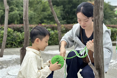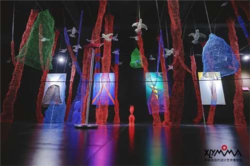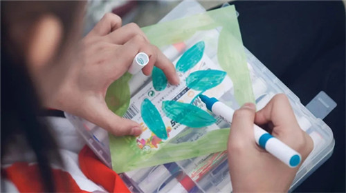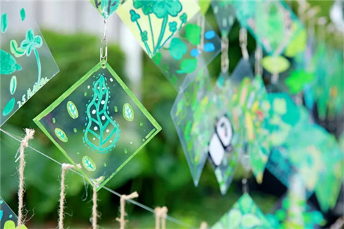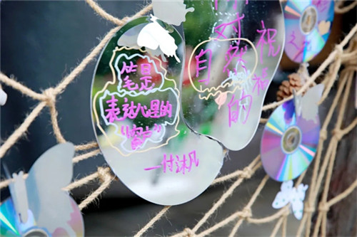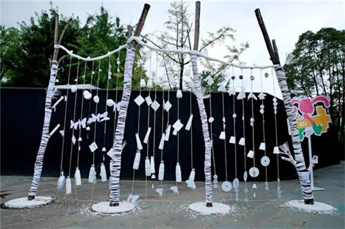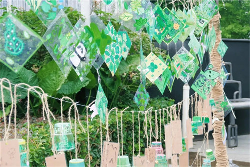 十根树木邂逅被遗忘的光盘、纸杯与牛皮纸。孩子们以手为心,赋予它们新的生命叙事:树干保留天然肌理,以螺旋、波点等各不相同的白漆笔触,刻画成长独有的轨迹;悬挂的光盘折射天光,摇曳的纸杯风铃与自然之声唱和。这件名为《自然回响》的装置,是一座由童心搭建的“风之竖琴”,让废弃与新生,在艺术的场域里完成一场沉默而有力的对话。