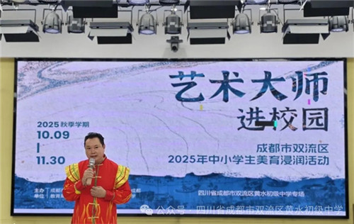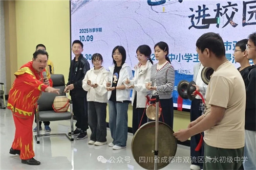 为传承中华优秀传统文化,筑牢青少年文化自信根基,2025年10月15日上午,一场别开生面的“艺术大师进校园”活动在成都市双流区黄水初级中学多功能厅精彩上演。本次活动特邀梁平癞子锣鼓资深研究专家、著名民间艺术家贺志灿老师走进校园,让学生近距离感受了非物质文化遗产的独特魅力,沉浸式体验了传统艺术的深厚底蕴。