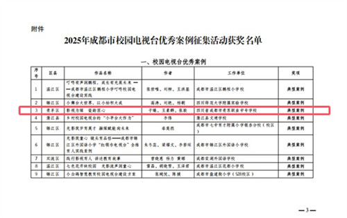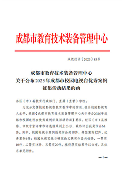 7月14日,成都市教育技术装备管理中心公布的2025年成都市校园电视台优秀案例征集活动结果中,青苏职中依托深厚的校园影视实践积累与鲜明的文化特色,在青羊区参赛单位中表现突出,多项成果获评重要奖项,进一步彰显学校校园影视教育的实践成效与示范价值。