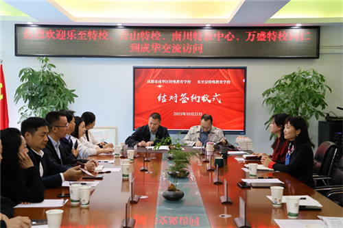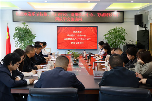 为促进特殊教育区域协同发展,凝聚特教智慧与力量,近日,乐至特校、营山特校、南川特教中心、万盛特校四所兄弟学校的同仁们齐聚四川师范大学特殊教育实验学校·成都市成华区特殊教育学校(以下简称:成华特校),共同开启了一场以经验共享、理念碰撞为核心的跨区域特教交流活动。成华特校以开放的姿态搭建交流平台,与四校同仁携手探索特殊教育高质量发展新路径。