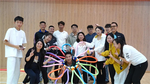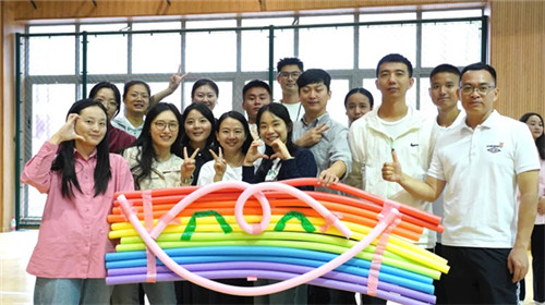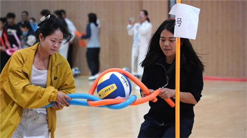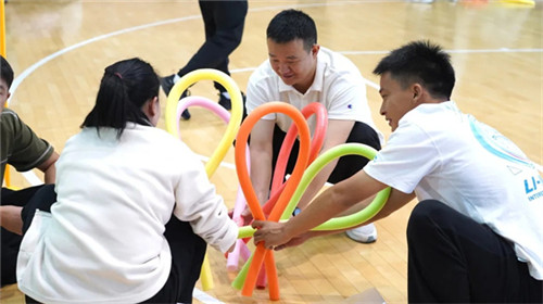 心理与体育教师联合设计的团体体验活动成为亮点。以彩色泡沫棒为媒介,通过“七彩萝卜蹲”“不倒森林”和运球接力等环节,教师们从陌生到协作,在互动中切身感受“心理+体育”融合的实践价值。