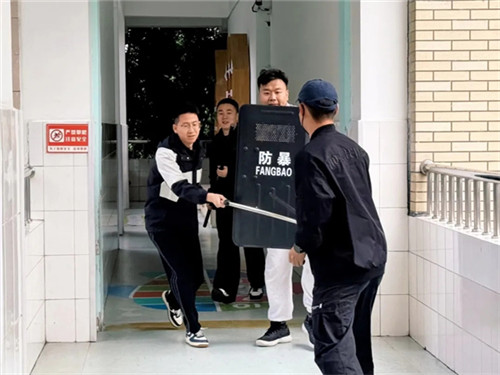 为确保演练高效有序,学校提前做好全方位准备工作。先是召开安全专题会议,明确演练重要性;再协调人员与装备,提前备齐钢叉、盾牌等防暴工具;同时,医疗保障组制定预案,确保受伤人员能第一时间得到救治,从“意识、人员、装备、医疗”四方面筑牢演练前的安全防线。
