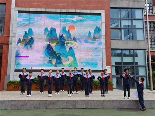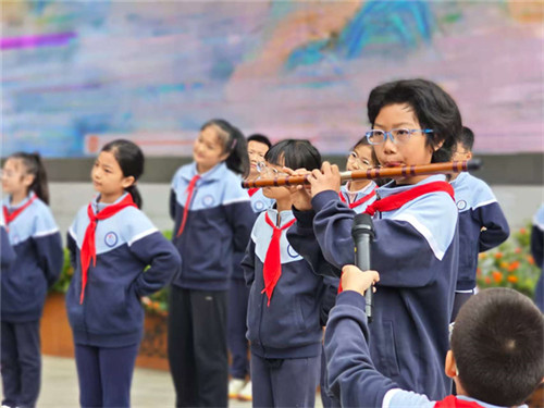 “二月天杨柳醉春烟……”清澈的竹笛声悠然响起,五(2)中队吴卡洛西同学的竹笛演奏如潺潺溪流,拉开了表演的帷幕。在她的笛声引领下,班级13名同学以整齐划一的手势舞,生动演绎出春日山野的蓬勃生机。他们的指尖跃动着成长的节拍,他们的歌声传递着向上的力量,仿佛在用青春的旋律告诉所有人:先辈的精神如同这和煦的春风,滋养着大家心中的理想之苗,陪伴大家在新时代的“春山”上努力攀登。
