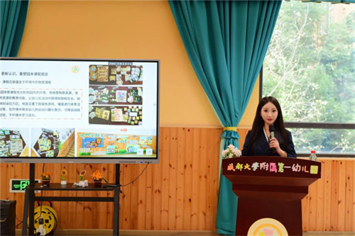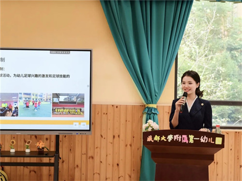随后,附一幼团队干货满满的分享接连展开。附一幼园点负责人李芸以《深化内涵建设 绽放“悦动”精彩》为题,解析园区以“悦动”为核心的特色发展路径;教科室主任曹智的《足球润泽童心 运动启迪成长》,分享足球课程如何从兴趣培养延伸至品格塑造;高川梅老师通过《绿茵征程,尽在“足”下》案例,生动呈现足球教育的落地实践与成效;刘凡老师的《玩转足球 乐在成长》为大家详细介绍了足球活动在中班主题活动中的实践探索,呈现了创新特色化教育的新生态。