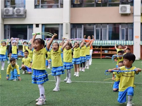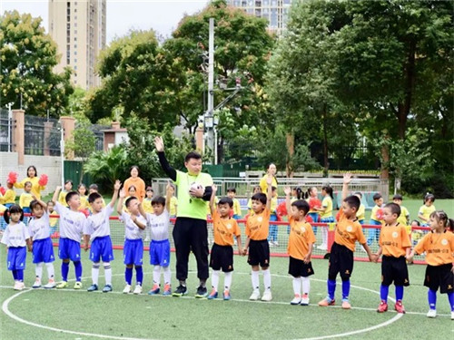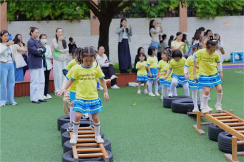 在户外操场,“稚橙足球赛”上幼儿的奔跑身影、早操环节的整齐律动,展现出体育教育的鲜活魅力;培训班老师们随后漫步楼道与教室,实地了解园区如何将“以儿童为本”的理念融入环境创设,让空间成为幼儿成长的“隐形老师”。