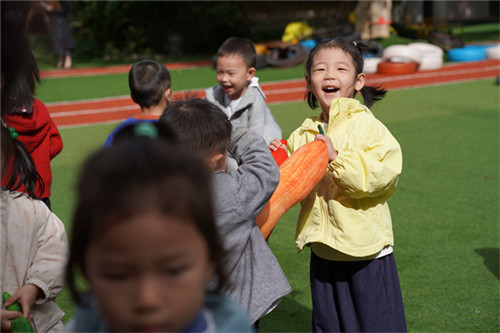 借助趣味的走跑活动,小可爱们用彩虹伞“烹饪”出各式各样的“甜甜蜜蜜”,在朗朗上口的儿歌和鲜明的奔跑节奏中,他们也学会了合理的迎面躲避技能。软软的蔬菜抱枕成为了他们运动的好朋友,举高高,夹夹跳,跨一跨,多种变化的背后也藏着教师们的设计智慧。