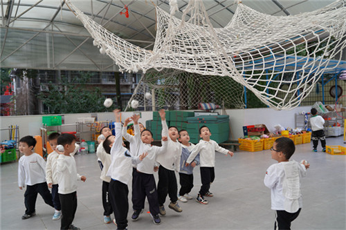 中一班结合本学期的线线主题,通过两根彩色线线编织出妙趣横生的运动游戏,孩子们化身成可爱的小猴子穿越“水帘洞”,感受着“唐僧骑马咚那个咚”民间跳皮筋的快乐,锻炼了跨、钻和跳的技能。飞跃的流星球在孩子们的手里变成了好玩的器械,结合流星球的弹性特点,操节的设计也更加有了互动性。