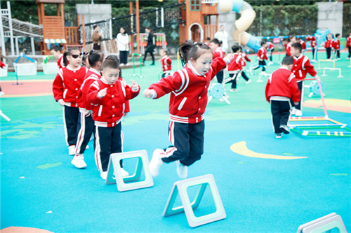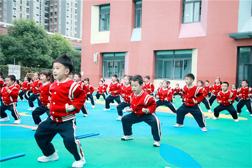 随着一楼操场响起熊猫主题的欢快旋律,半日观摩的第一个高潮如期而至。大班幼儿带来的“悦动功夫熊猫操”活力开演。孩子们在队列变换中感知空间方位,在动作节奏里理解速度变化,将运动与数学思维巧妙融合,赢得来宾阵阵掌声。