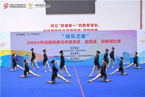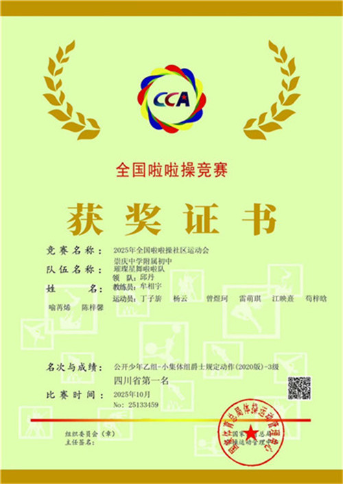 在随后参加的“快乐之星”2025年成都市青少年健美操、啦啦操、韵律操比赛中,崇州市崇庆中学附属初中代表队延续了高昂的斗志和优异的竞技状态,最终以475分的全场高分夺得初中组爵士项目第一名。