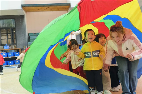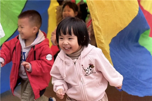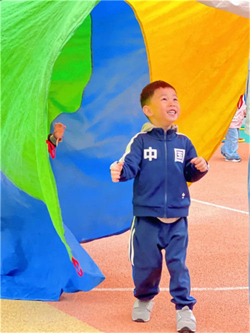 小班孩子们乐在参与,他们牵着彩虹伞,跟着欢快的音乐一起“举伞、抖伞”,彩色伞面在运动场上开开合合,像朵会动的大花。
