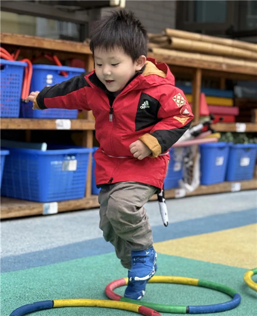 老师们也利用身边的辅助材料圈、绳等,和孩子们玩起了小动物闯关游戏。