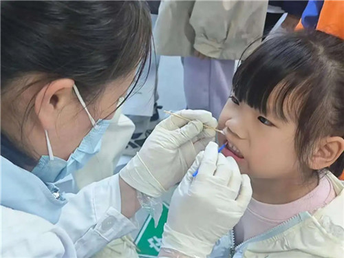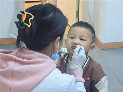 儿保科医生对幼儿口腔进行全面检查,细致排查龋齿、牙釉质发育等问题,并为宝贝们开展无痛涂氟服务。过程中,医护人员用童趣化语言引导宝贝配合,从“抗拒”到“主动张嘴”,宝贝们化身勇敢的“护牙小卫士”