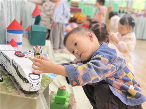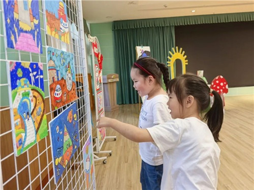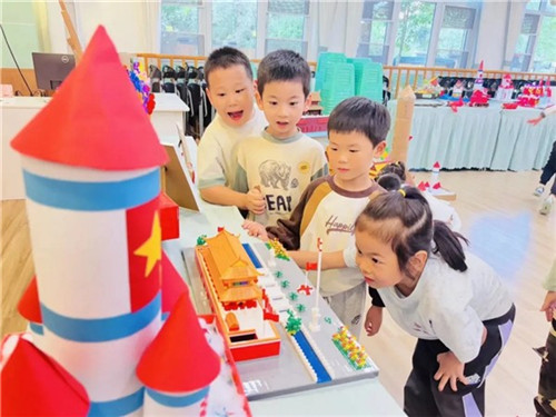 展示环节设于幼儿园多功能厅,入围作品按“锦绣祖国”“航天梦想”“未来城市”三大主题分区陈列。孩子们漫步展厅,共同欣赏一件件充满童趣的作品,他们不时驻足,指着自己或同伴的创作与好朋友分享想法,展厅内满是温馨互动的画面。