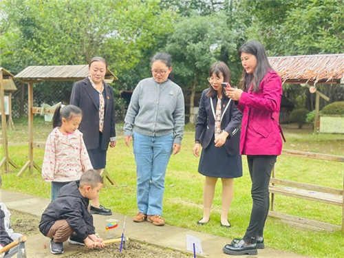 接下来,参会老师分组走进“小小红星馆”“七彩田园”“丛林探险”等园区环境,观摩幼儿活动。现场,孩子们通过红色绘本共读、沙地“长城”建构等活动,以稚嫩的话语和专注的实践,将爱国情感自然传递。
