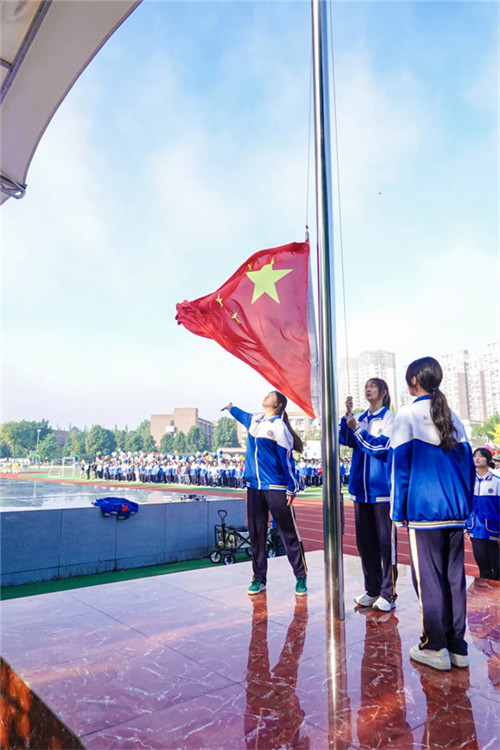 庄严升旗,爱国情满。全校师生肃穆行礼,鲜艳的五星红旗冉冉升起,雄壮的国歌声在校园上空回荡,师生胸中激荡的是滚烫的爱国情,眼底闪烁的是坚定的强国志。