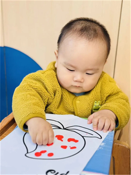 在咿薇托育新华南园,孩子们化身小小的“时光魔法师”,用手指点染缤纷色彩,为画中爷爷奶奶的发梢添上灵动色彩。