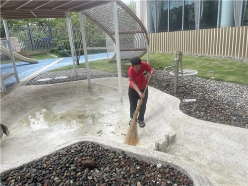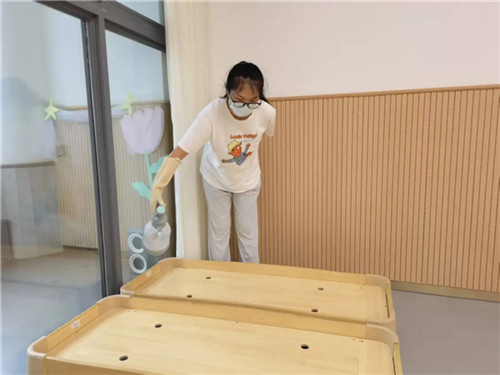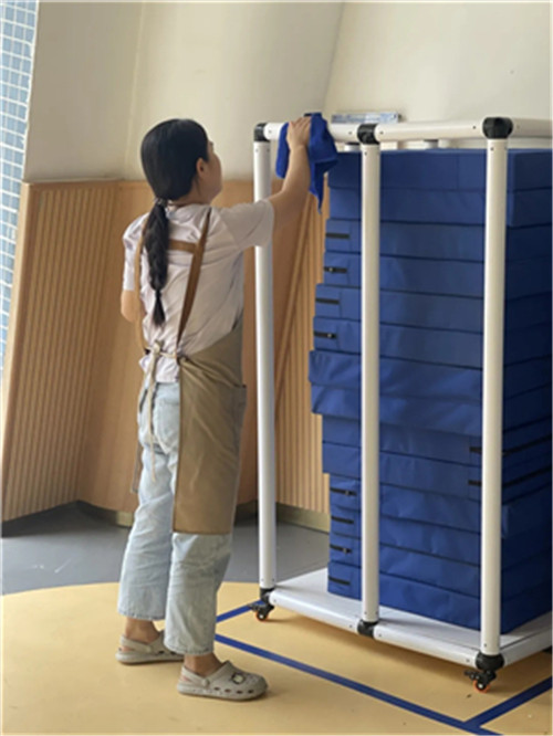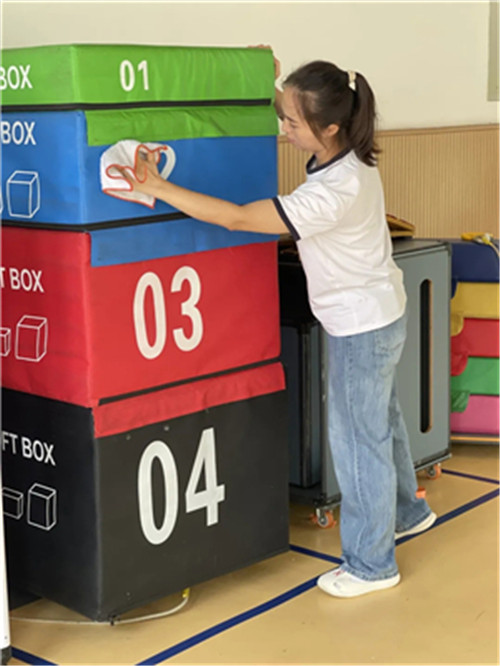 此外,食堂与玩教具的卫生安全是本次行动的重中之重。食堂在开园前已对所有餐具、炊具及环境进行了持续深度清洁消毒。户外大型玩具、体育器械等也均经过全面清洗与消毒处理,确保幼儿在园的各项活动均能安全、放心地进行。