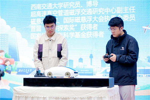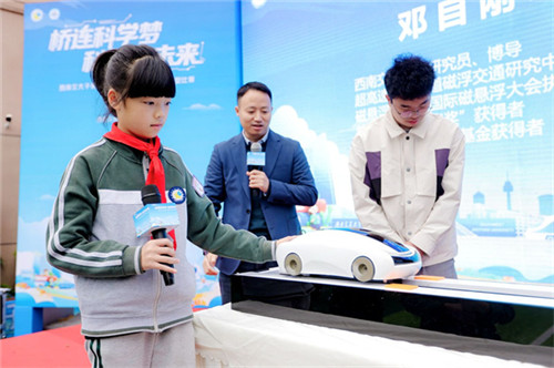 邓自刚更在现场透露一个振奋人心的计划:在明年西南交通大学130周年校庆之际,将推出可载人的磁悬浮汽车,为母校献礼!这一消息让台下的小科学迷们激动不已,掌声经久不息。展示尾声,邓自刚以自身经历勉励同学们:“打好基础、坚持不懈,是走向创新的必经之路。”