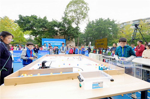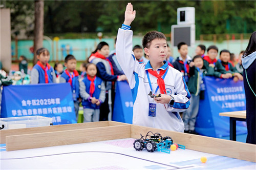 赛场另一端,金牛区人工智能决赛现场同样战况激烈。16所学校的编程高手们齐聚一堂,展开智慧交锋,每一轮精彩对决都引得观众席爆发出阵阵喝彩。与此同时,各个科创体验展位也化身为“未来游乐园”。同学们在志愿者引导下兴奋穿梭,在“VR科幻书画”中挥洒创意,看“AI闪绘”秒速生成个性艺术,与“下棋机器人”展开智慧博弈,还在“陶瓷青花转印”中感受科技与传统的奇妙碰撞。此起彼伏的惊叹声与欢笑声,将整个体验区变成了充满未来感的探索天地。