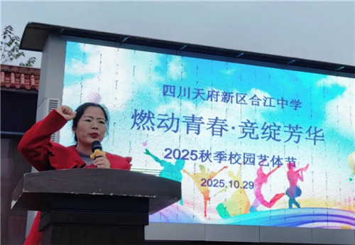四川天府新区合江中学专职副书记王健为艺体节开幕式致辞,他提出“三个一”理念:体育是一门“最好的德育课”;艺术是一面“最亮的聚光灯”;赛道与舞台是一条“双向奔赴的成长跑道”。同时,他希望大家尽情参与,享受过程,展现各自优秀风貌。