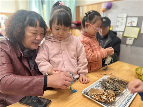 教室里暖意融融,孩子们拉着长辈的手,开启了满是传统韵味的温馨互动时光:一起缝制香包、制作艾草锤、蒸制糕点,细数、倾听老物件里的岁月故事,还端上践行“以茶敬长”礼仪的温热菊花茶,每一个小活动都满是祖孙亲密,更让传统民俗在欢笑中悄悄传承。