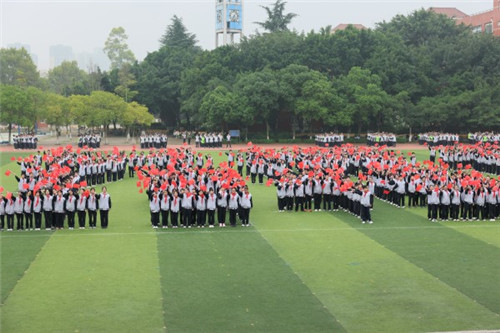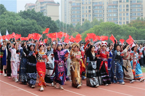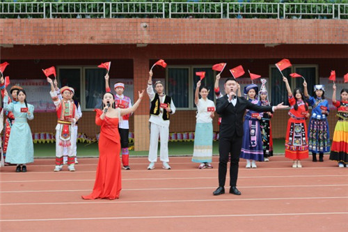 随后,曾成彬书记庄严宣布:“成都市三原外国语学校第十一届体育节开幕!”将现场气氛推向高潮。开幕式表演环节,全校师生在徐健峰老师指挥下齐唱《强军战歌》,潘粤、钟莉老师联袂献唱《我爱你中国》,五十六个民族学生代表伴舞,展现中华民族一家亲的深厚情谊。