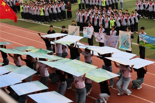 各方阵展示独具特色:初二年级的“基础建设”方阵以高铁、桥梁、5G网络等道具,展现国家发展硬实力;初三年级的“科技创新”方阵通过航天、深海探测等模拟表演,激发探索精神;高一年级的“绿色发展”方阵倡导人与自然和谐共生;高二年级的“文化繁荣”方阵融合戏曲、武术等传统元素与现代艺术体操,彰显文化自信。跑操方队喊出“九天揽月·深蓝探秘”“绿水青山·金山银山”等口号,展现新时代青年的壮志豪情。