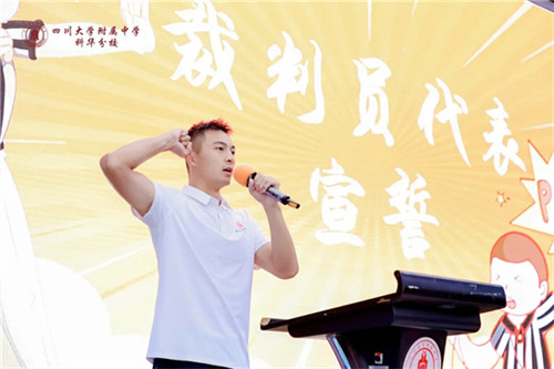 运动员代表傅宇煊同学与裁判员代表李兴林老师分别宣誓,承诺将恪守规则、公平竞争、公正执裁。