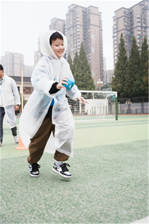 同时,趣味闯关项目在户外操场冒雨进行。学校4位“小勇士”不惧风雨,依次挑战了趣味羽毛球、趣味足球、趣味乒乓球、趣味滚球和趣味田径五个项目。在湿滑的场地上奔跑、击球、投掷,沾满雨水的脸庞上都写着专注与坚持。这份不畏艰难、全力以赴的体育精神,最终为他们赢得了象征毅力与实力的“闯关达人”荣誉称号。