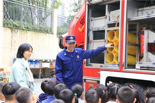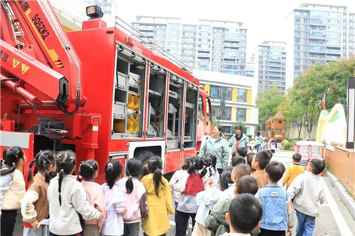 消防员叔叔打开消防车舱门,向孩子们展示救援装备。孩子们好奇围站,认真聆听消防服作用与水带连接方式,在趣味互动中认识工具、深化消防安全理解。
