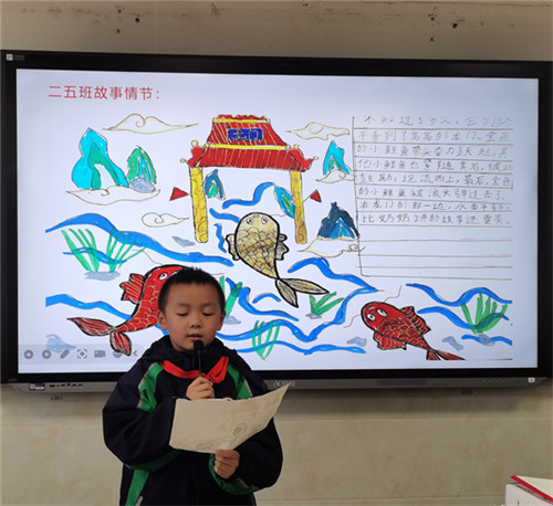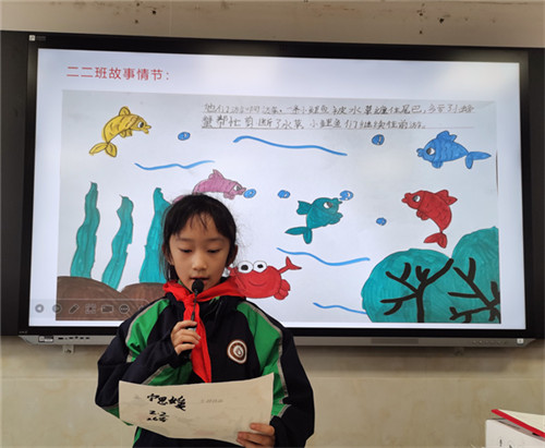 活动以班为单位,将整个故事分解为6个关键场景,每个班画一个场景,再为每个场景撰写一段简短的“画面描述脚本”,最后由一名同学现场朗诵。二年级的孩子们在这场活动中尽情发挥想象,在创造的天空中自由翱翔,活动分别评出了绘画之星、书写之星、朗诵之星。