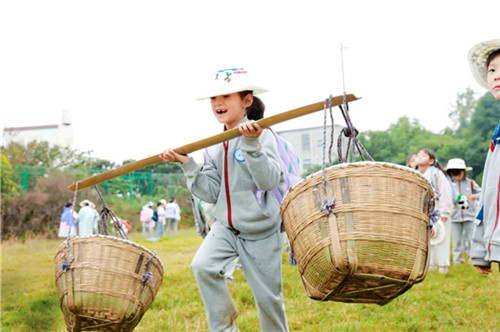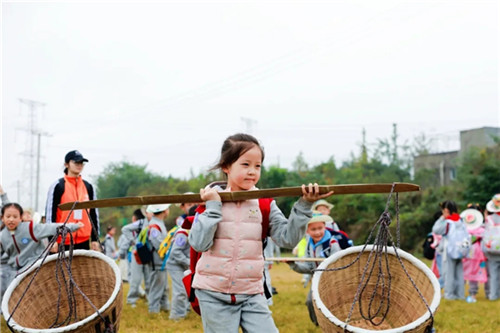 实践活动后,充满趣味的体验项目有序开展。挑箩兜活动同样吸引了大批孩子。看着两头挂着竹编箩兜的扁担,孩子们既好奇又兴奋,纷纷跃跃欲试。老师先示范正确的挑担姿势:双手扶着扁担,腰背挺直,脚步放慢。一开始,孩子们刚把扁担放在肩上,就因为重心不稳晃个不停,有的甚至差点把箩兜甩到地上,引得周围一阵笑声。但大家没有气馁,在老师的耐心指导下,终于能稳稳挑起箩兜,哪怕只走了短短几步,孩子们也欢呼雀跃,在用力的过程中,真切感受到了传统农具背后的劳动智慧。