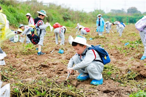 在挖红薯活动中,在田间搭建了临时避雨棚。来到棚下,看着绿油油的红薯藤,孩子们迫不及待地拿起小锄头,在老师的指导下开始挖掘。有的蹲在地上轻轻扒开泥土,有的小心翼翼地顺着藤条寻找红薯的位置,泥土偶尔沾到小手,大家笑着擦掉继续挖。当一个个裹着泥土的红薯从地里被“揪”出来时,瞬间响起阵阵欢呼。“我挖到一个大红薯啦!”“你看我的红薯像小灯笼!”孩子们举着自己的“战利品”互相炫耀,也在劳作中体会到了农民伯伯的辛苦与粮食的珍贵。