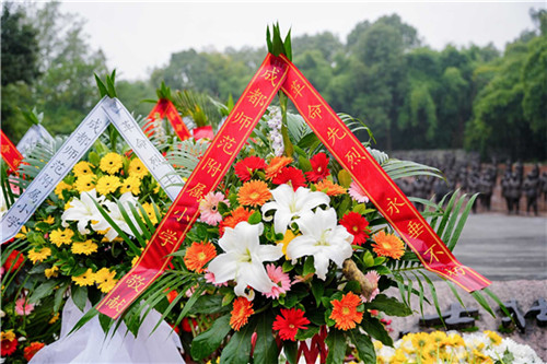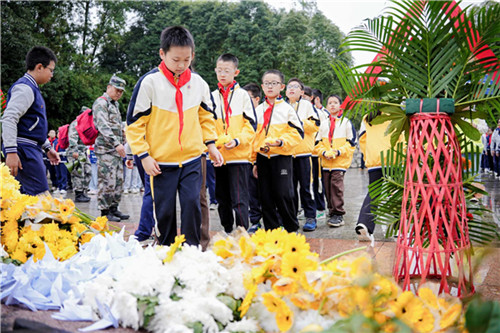 为表达对革命先烈的无限崇敬与深切缅怀,全体师生在庄重的群雕广场举行了简短的祭奠仪式。学生代表稳稳抬起花篮,缓步前行,将敬献的花篮轻轻摆放在群雕前。全体师生肃立默哀,向为民族独立和人民解放事业英勇献身的英烈们鞠躬,并依次上前敬献手中洁白的菊花。这一朵朵鲜花,寄托着金穗学子对英雄的哀思,也象征着红色基因的传承与延续。让书本上的爱国主义精神化为了一次可感、可触的实际行动。